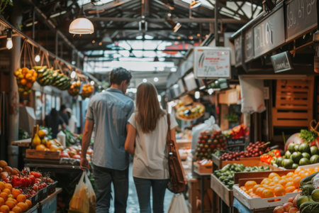 A couple strolling hand in hand through a vibrant farmer's market.. --ar 3:2 Job ID: 8a7fef00-1211-493d-b31a-68d4ff6ce681