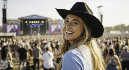 Smiling young woman with long blonde hair and a black cowboy hat, enjoying an outdoor music festival with a large crowd and stage in the background.