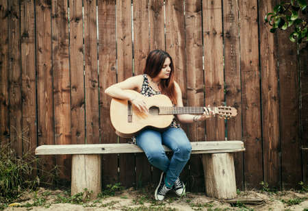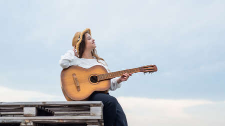 teen hipster playing on guitar. singer with acoustic guitar. music and art. musical shop. happy girl enjoy the moment. Have Fun on Celebration. kid singing with guitar