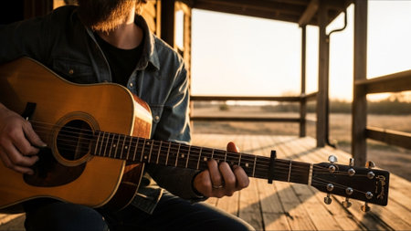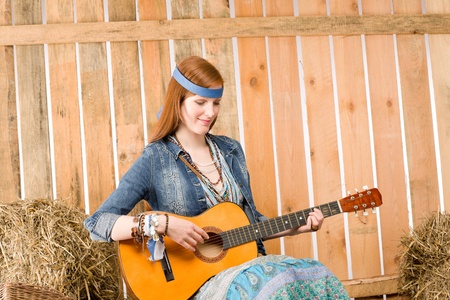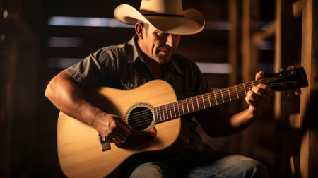 Country guitar strumming in barn rustic charm with sunlight and hay