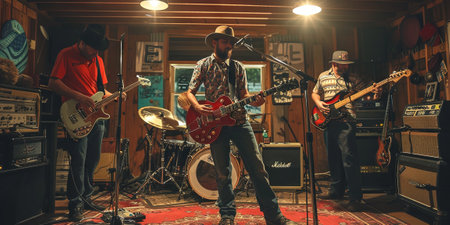 Passionate group of musicians playing together with intensity, medium shot with blurred background