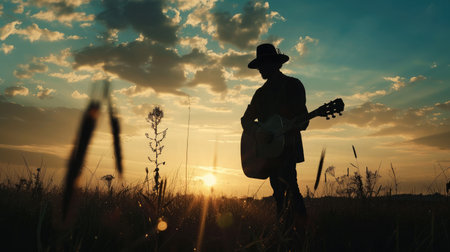 Young man in cowboy hat playing acoustic guitar in field at sunset.