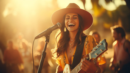woman wearing a bohemian style, playing a guitar on field at warm light of sunset
