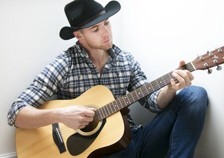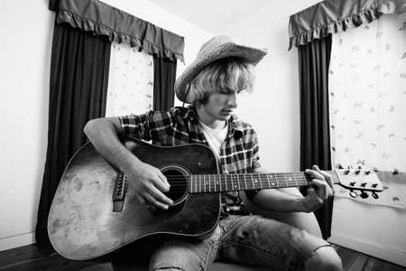 Country and Western singer, cowboy plays guitar in his hotel room under skylight