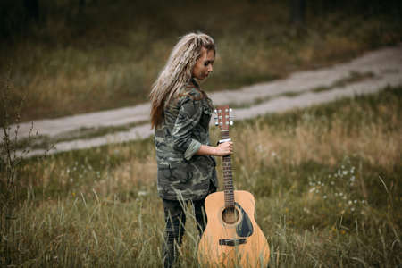 Pretty sad woman guitar nature fashion look concept. Unity with nature.