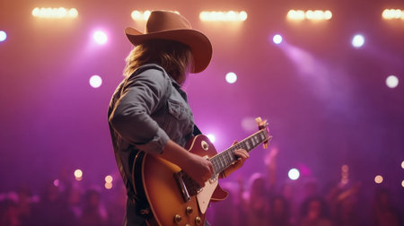 Young caucasian man musician in a cowboy hat joyfully playing electric guitar at concert.