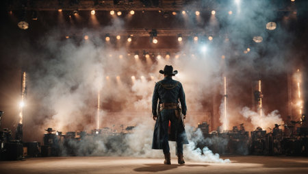 Cowboy Performing Live Music at Night Under Colorful Lights