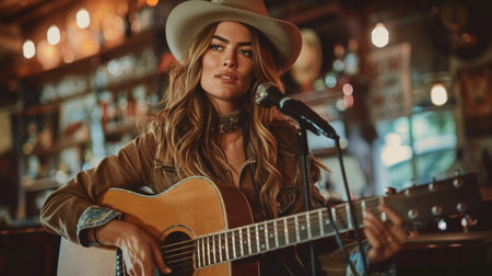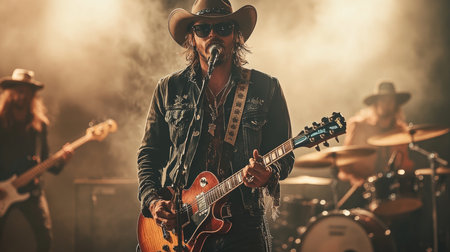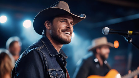 Country musician performing live on stage with guitar in vibrant concert atmosphere