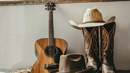 a cowboy hat, lasso, and boots set against a white background, accompanied by a guitar, evoking the spirit of the Wild West and the soulful tunes of country melodies
