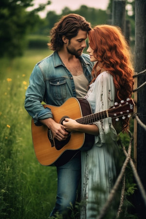Romantic sweet shot of cute young couple embracing one another and enjoying sunset outdoors spending evening in countryside musician with guitar behind back hugging tight : Generative AI