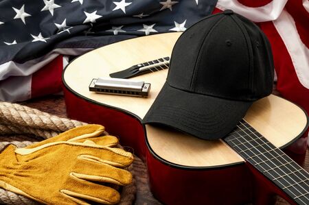 American culture, blues music and country music concept theme with a black baseball cap, USA flag, acoustic guitar, harmonica and a rope lasso on a wooden background in a old saloon