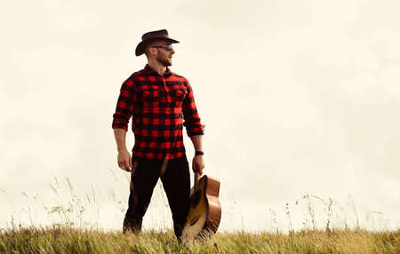 Solely Graceful. hipster fashion. happy and free. western camping and hiking. cowboy man with acoustic guitar player. sexy man with guitar in checkered shirt. country music song