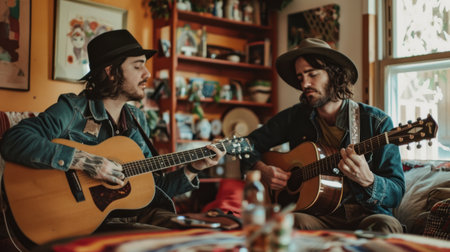 Two musicians playing acoustic guitars and harmonizing vocals in a cozy living room.