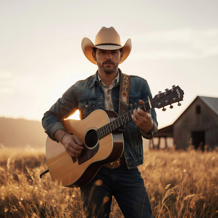 Acoustic guitar country musician in barn hay and cowboy boots setting