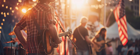 National Flag Day (USA) background showcasing an outdoor concert with a stage adorned with American flags, musicians playing, and a crowd of people enjoying the event.