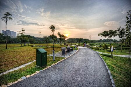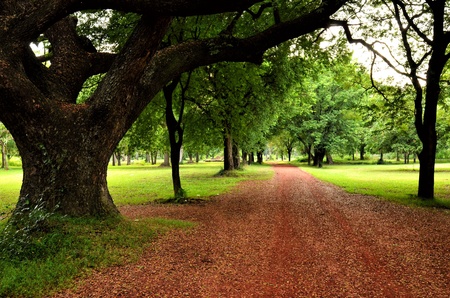 dramatic asphalt path way in fall autumn public park with warm light for background , relax or fresh concept vintage tone