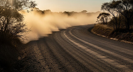 A car kicks up a large dust cloud on a dirt road in the Australian outback at sunset.