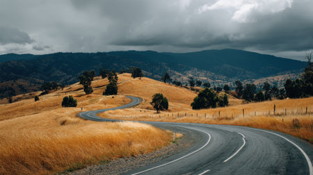 A serene winding road meanders through golden hills, set against a dramatic cloudy sky. This stunning rural landscape captures the essence of tranquility and beauty in nature.