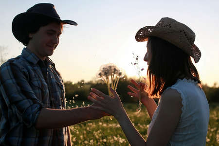 Happy beautiful brunette teenage girl dressed in a white sweater, jeans and cowboy straw hat standing in a field holding dry bouquet