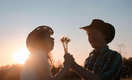 A couple in love kiss in the field on beautiful sky background. Profile, sunset light.