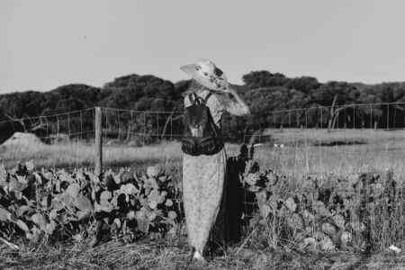 A woman in a flowing dress and wide-brimmed hat standing by a wooden fence during sunset, with a house and trees in the background