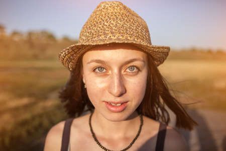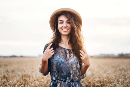 Portrait of a beautiful young woman in a straw hat and dress on a wheat field at sunset.