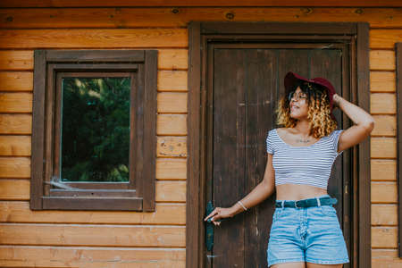 Portrait of a cute hipster girl in a plaid shirt and a stylish hat standing in a pine forest. Summer vacation in nature. Tourism.