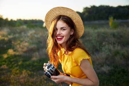 Woman in a hat with a camera in her hands red lips attractive look nature