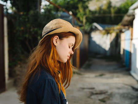 A young girl is traveling around the city hitchhiking. A beautiful young girl went on vacation. A female student in a cowboy hat on the road.