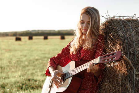 Young blonde woman plays guitar near a haystack in a field in the sunset