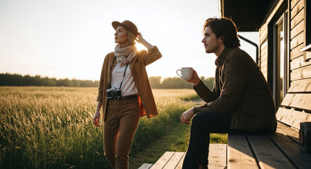 Beautiful young woman and man in warm clothes are drinking coffee and smiling while sitting on the porch of a country house