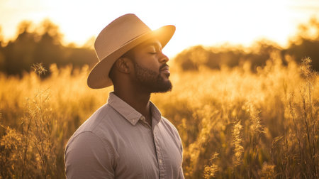A man stands serenely in a vast golden field, wearing a stylish wide-brimmed hat, absorbing the peaceful atmosphere and warm light of sunset.