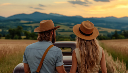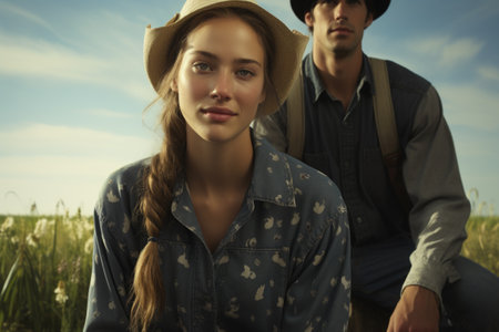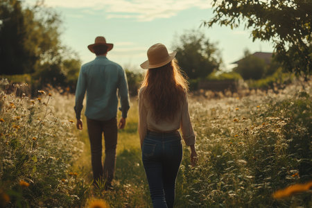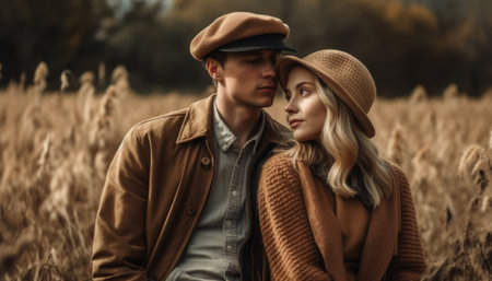 Couple standing together in grassy field. This image can be used to depict love, relationships, or enjoying nature.