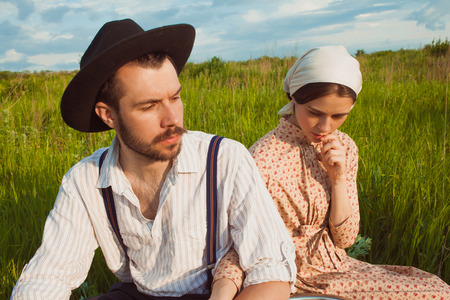 family farmer examines field of cereals. farming and agriculture. man and woman in village outdoors.