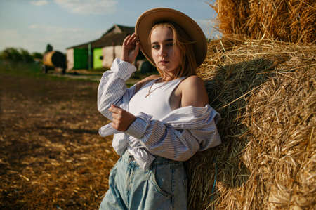 Beautiful cowboy woman Posing near at the haystacks, Fashion concept.