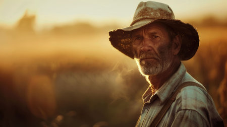 A man stands peacefully in a sunlit field, wearing a straw hat and a light shirt, as the golden rays of the sunset create a tranquil atmosphere.