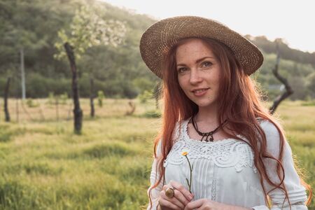Beautiful teen girl with red hair and freckles in red dress sitting among the mealow touching her hat with hand and looking at the camera