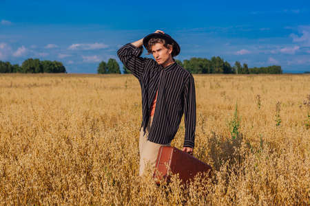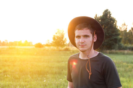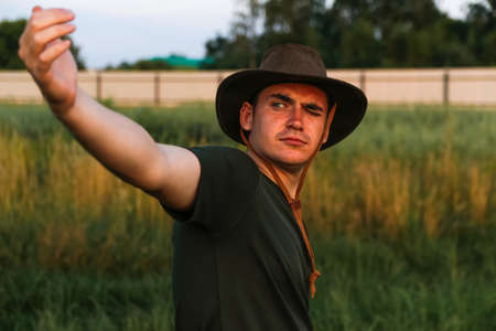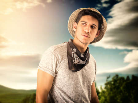 Cowboy man wearing western hat with straw in mouth in country farm background. Happy American Male model in american countryside landscape nature on ranch or farm, Utah, USA