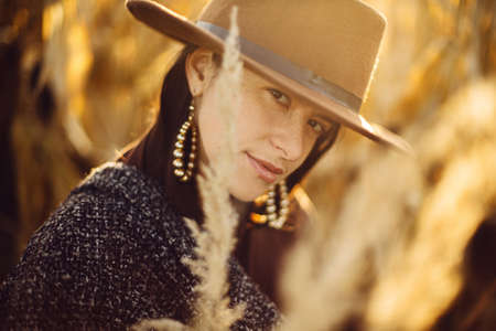 Beautiful stylish woman in brown hat and vintage coat posing in autumn maize field in sunset light. Portrait of fashionable young hipster female standing in autumnal corn in evening countryside
