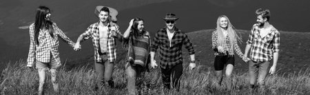 Group people in a hike through the mountains. Friends on a camping trip walking. Happy friends walking on mountain. Friends spring travel vacation banner. Friendship holiday concept.