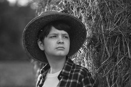 Black and white portrait boy in straw hat standing near hay bale in a field.