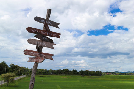 Old wooden vintage Directional signs and blue sky background, image with copy space.
