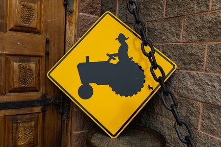 Tractor crossing warning road sign used as decor with Metal chain on Traditional barrel next to a wooden door, vineyard house entrance