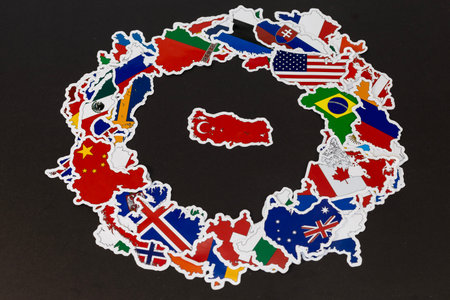 Turkey Map Surrounded by International Flag Stickers on Black Background
