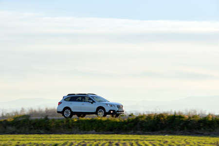 SUV car driving fast on intercity road at sunset. Highway traffic in evening