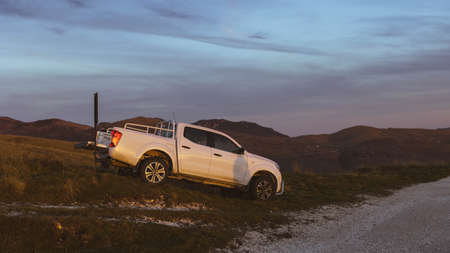 Car parked in the nature with sunset light on side