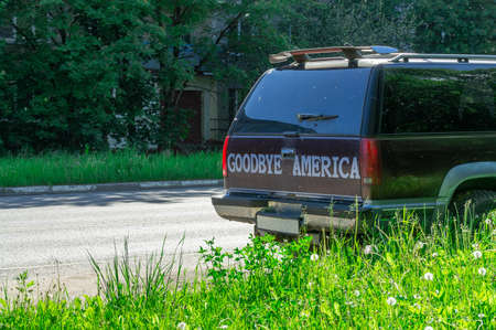 goodbye america the inscription on the back door of a leaving car