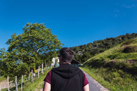 Active tourist, a man with a briefcase in nature, a hipster in a cap is walking along a path on a green hill, healthy lifestyle, nature, rest