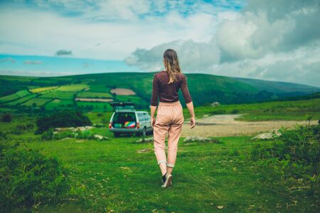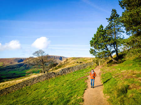 A tourist in Peak District, an upland area in England at the southern end of the Pennines, UK