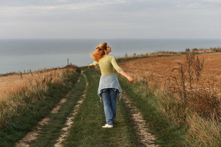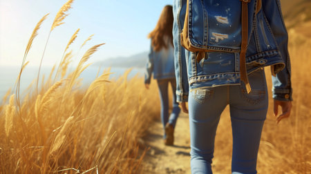 Adventurous traveler in denim walking through a field of wild grass at sunset